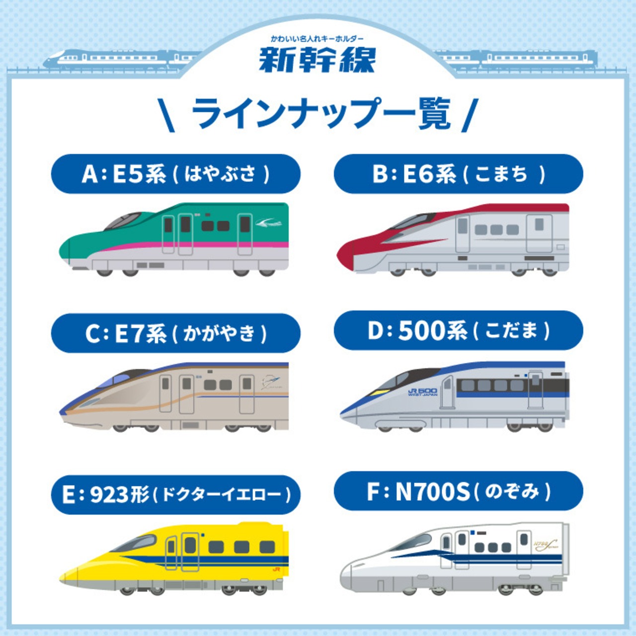 両面印刷対応。新幹線の魅力をたっぷり詰め込んだキーホルダーは、可愛らしくデフォルメしつつ、新幹線ならではのカッコよさはそのまま。かわいい&かっこいいが共存した『よくばりデザイン』だから、飽きづらく長く愛用できます。