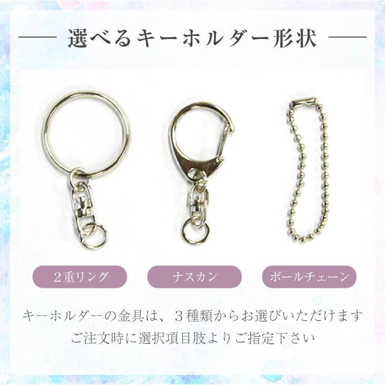 キーホルダーのタイプはお選びいただけます(2重リング・ナスカン・ボールチェーン)